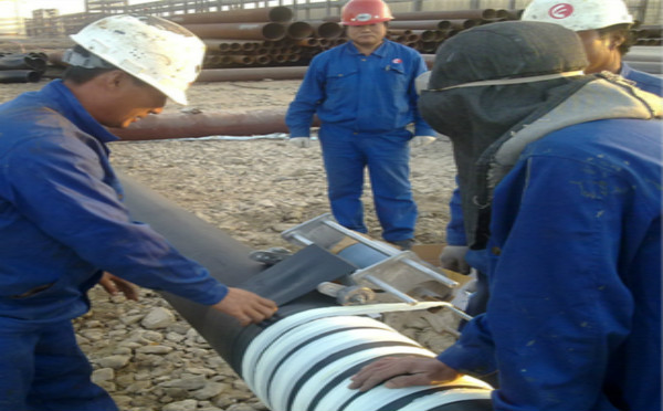 4、纏繞膠帶以搭接帶寬的50~55%進(jìn)行,形成一遍兩層,滿足特加強(qiáng)級(jí)別,達(dá)到總厚度≥2.0mm。在施工過程中要增大膠帶的平衡漲力,達(dá)到緊貼于表面,實(shí)現(xiàn)包平無空隙、無皺折效果。