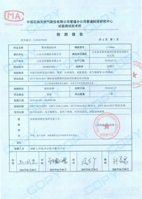 按照SY/T0414-2017要求,聚丙烯防腐膠帶的生產廠家應為使用方,提供由國家認可實驗室,對其產品依據制造標準,測試檢驗的性能指標完全符合的報告。使用前對聚丙烯防腐膠帶的厚度、基材拉伸強度、對底漆鋼剝離強度、對背材剝離強度、電氣強度、體積電阻率,以及吸水率和水蒸氣透過率進行復檢,測試是否滿足要求,性能指標達不到的杜絕使用。
